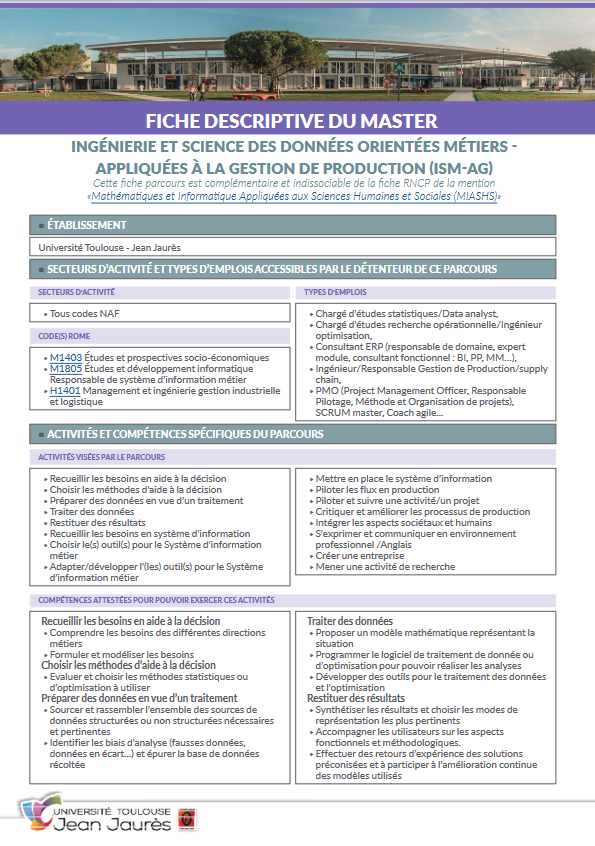 Le master "Ingénierie et science des données orientées métiers - application à la gestion de production (ISM-AG) " est un parcours du Master Mathématiques et informatique appliquées aux sciences humaines et sociales - MIASHS .