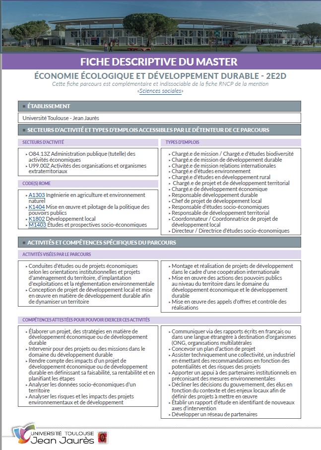 - Identifier, évaluer et rendre compte des impacts d’un projet de développement économique ou de développement durable, en définir sa faisabilité, sa rentabilité et en planifier les étapes
